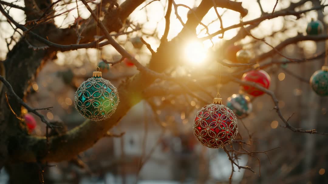 AI Generated Video. Ornate green and red baubles sway in gentle breeze, hanging from branches with warm sunlight creating charming lens flares. Ideal for Christmas-themed marketing, holiday greeting cards, advertising festive decor, or cozy end of year campaigns focused on peace and warmth.