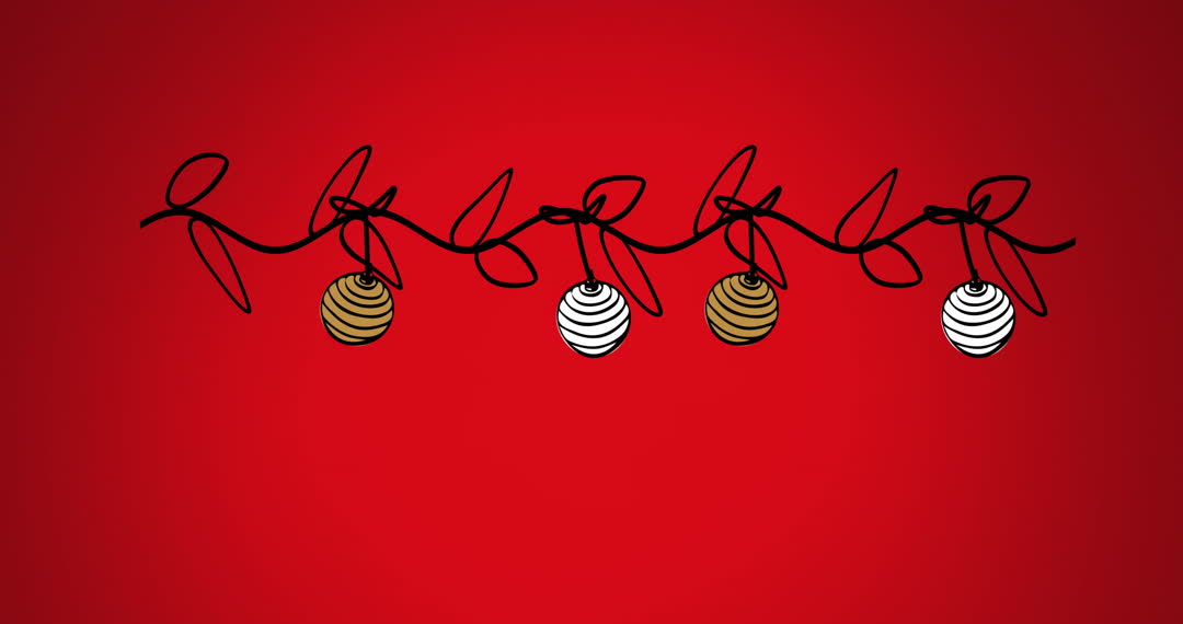 Illustrated baubles hanging on loops of twigs with a rich red background celebrating a festive theme perfect for holidays. Ideal for winter seasonal decorations, holiday cards, or online festive content emphasizing joy and celebration.