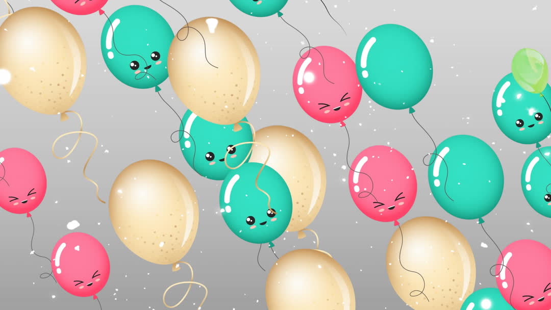 This vibrant and playful video features colorful cartoon balloons with expressive faces against a backdrop of gently falling snow on a grey background. Perfect for use in holiday greeting cards, party invitations, festive decorations, and playful social media graphics.