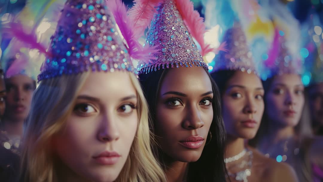 AI Generated Video. Video features a dynamic and colorful performance with four dancers in sequined costumes and cone-shaped hats, creating a festive and glamorous atmosphere. The lighting flickers, highlighting their intense gazes, embodying the excitement and energy of a lively stage show. Suitable for use in projects related to festivals, celebratory events, stage performances, entertainment advertisements, and artistic productions capturing the essence of joy and vivacity.