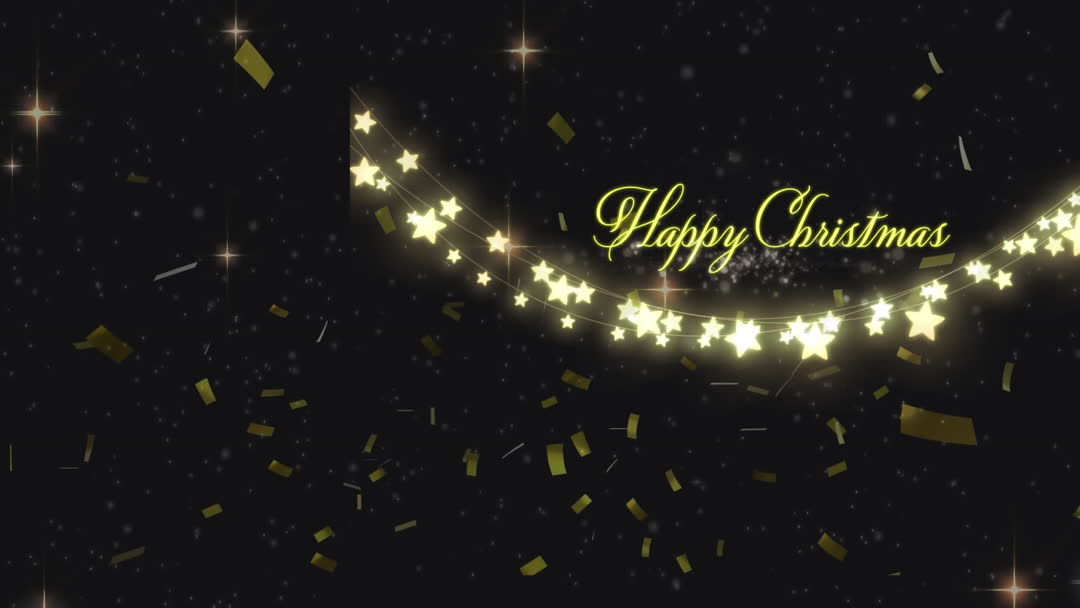 Charming animation with a festive Christmas message features glowing stars and golden confetti on black background, creating a celebratory and joyful atmosphere. Perfect for use in holiday cards, digital promotions, social media content, or festive video greetings to enhance holiday spirit and decorations.