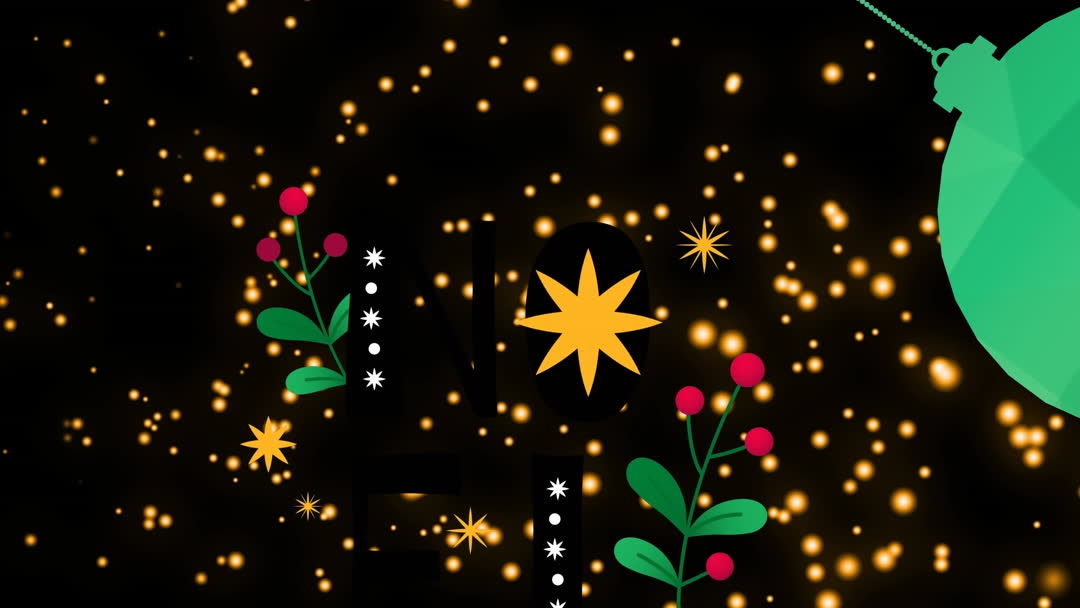 Animated scene features sparkling snowflakes falling with Noël text over luminous golden background, complemented by green holiday bauble and foliage graphics. Ideal for festive greeting cards, holiday video animations, social media posts celebrating Christmas and year-end festivities.