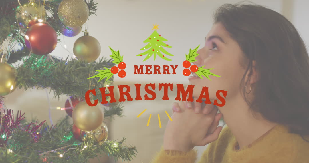 Animation portrays text Merry Christmas over video of woman gazing at decorated Christmas tree symbolizing holiday spirit. Perfect for festive greeting promotions, social media posts, and Christmas advertising.