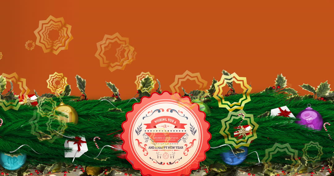 Features a colorful composition centered around a merry Christmas message with accompanying festive decorations. Golden stars animate over the Christmas banner, enhancing a joyful holiday atmosphere. Ideal for Christmas greeting cards, holiday promotions, or festive website banners wishing Merry Christmas and Happy New Year.