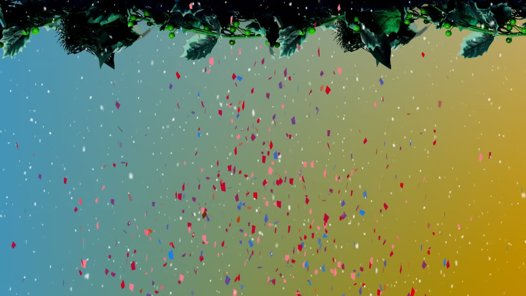 Colorful confetti falls against a gradient background with an elegant wreath border overhead. Perfect for holiday seasons, Christmas celebrations, invitation designs, festive banners, and uplifting seasonal wallpapers.