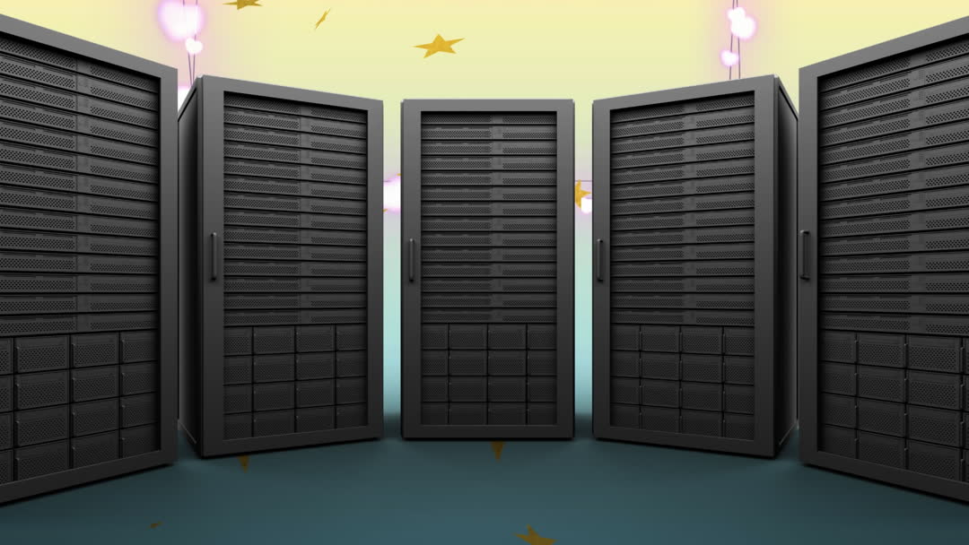 Image depicting computer servers adorned with colorful Christmas decorations and falling stars, creating a unique blend of technology and festivity. Useful for articles or promotions related to holiday tech trends, digital security during the festive season, or technology companies celebrating Christmas. Also suitable for social media content highlighting the whimsical side of tech environments. This dual-theme video captures the contrast between industry and celebration.