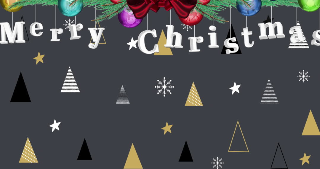 The design features joyful Christmas ornaments and the phrase 'Merry Christmas' in festive typography, set against a sleek grey background with abstract Christmas trees and stars. Ideal for holiday greetings, themed digital announcements, or festive event invitations.