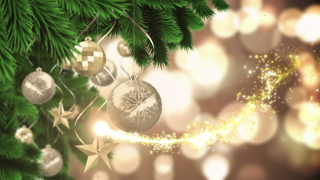 This festive scene captures gold and silver ornaments elegantly hanging from a Christmas tree with a sparkling overlay flowing beautifully. Ideal for holiday promotions, seasonal greetings, or festive-themed projects. The design offers ample copy space for advertisements, invitations, or social media posts.