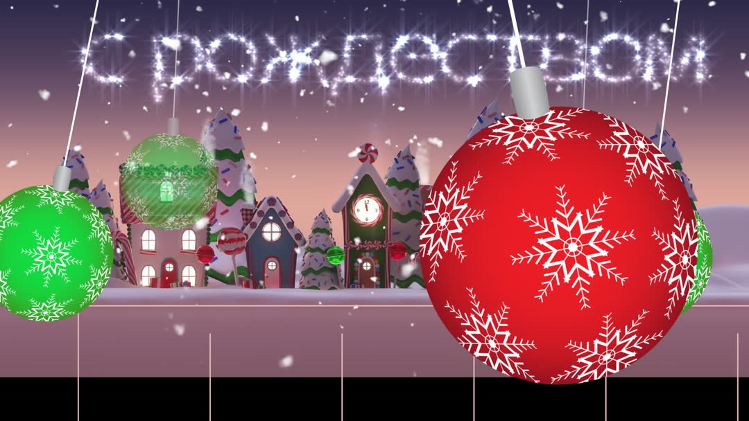 An animated background featuring Christmas greetings in Cyrillic text, along with colorful Christmas baubles adorned with snowflakes, set in front of a charming, wintry village scene. Ideal for holiday cards, festive presentations, digital greetings, and winter-themed promotional materials.
