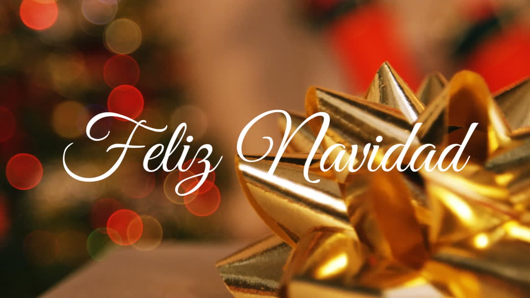 Image features elegant 'Feliz Navidad' text over sparkling Christmas decorations, including an intricate golden bow, perfect for creating holiday greeting cards, festive event invitations, or celebratory digital content.