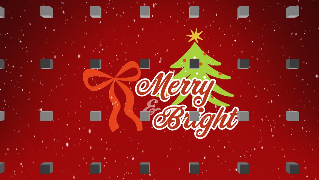This design features a festive Christmas greeting with the words 'Merry & Bright' alongside a green Christmas tree and a decorative red bow, set against a snowy red background with a cube pattern. Ideal for holiday cards, digital invitations, decorations, and Christmas-themed marketing materials. The cheerful layout offers a dynamic and modern twist on traditional holiday visuals, suitable for spreading holiday cheer.