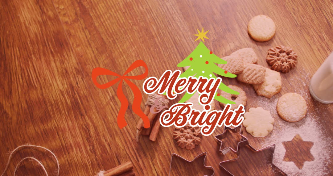 A joyful animated Christmas greeting with seasonal elements. This design is ideal for holiday cards, festive invitations, or social media posts celebrating the spirit of the season. Featuring classic cookies, cinnamon sticks and a symbolic Christmas tree and bow.