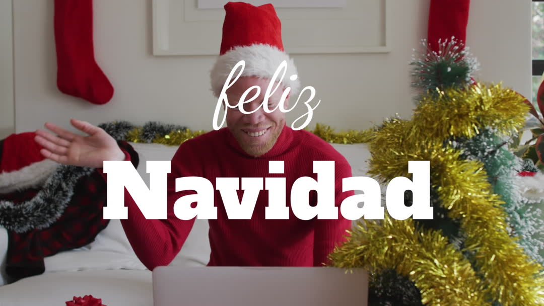 Featuring "Feliz Navidad" text over an animated scene with a person wearing a Santa hat engaged in a virtual call, this video embodies the joyous spirit of Christmas celebrations. Suitable for holiday greeting cards, festive social media posts, and Christmas promotional materials to enhance a sense of warmth and connection.