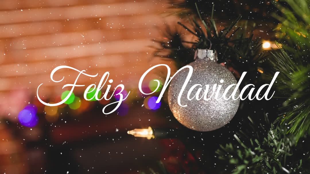 Silver bauble ornament hanging on Christmas tree with snow on text 'Feliz Navidad'. Dazzling holiday lights create festive ambiance, making ideal for Christmas greetings, festive event invitations, or seasonal social media posts celebrating global holiday spirit.