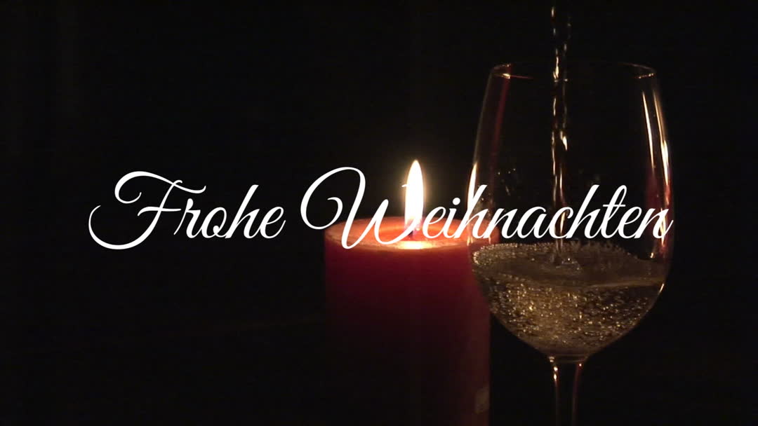 Elegant design featuring Christmas greetings in German with a candle and glass of wine creates festive ambiance. Ideal for holiday cards, social media posts, and Christmas event promotions.