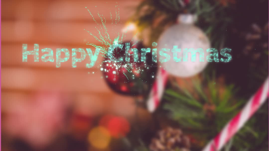 A dynamic visual focusing on a merry Christmas greeting placed in front of a beautifully decorated tree filled with baubles and candy cane decorations. Text features sparkling animations for a joyful holiday theme. Suitable for use in holiday greeting videos, online websites for wishing seasons' greetings, or adding festive cheer to digital content across social media or other online platforms.