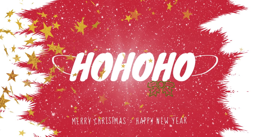 Design features 'Ho Ho Ho' text surrounded by glittering stars and a softly falling snow effect set against a red background. Perfect for digital greetings, social media posts, festive announcements, and holiday-themed presentations.