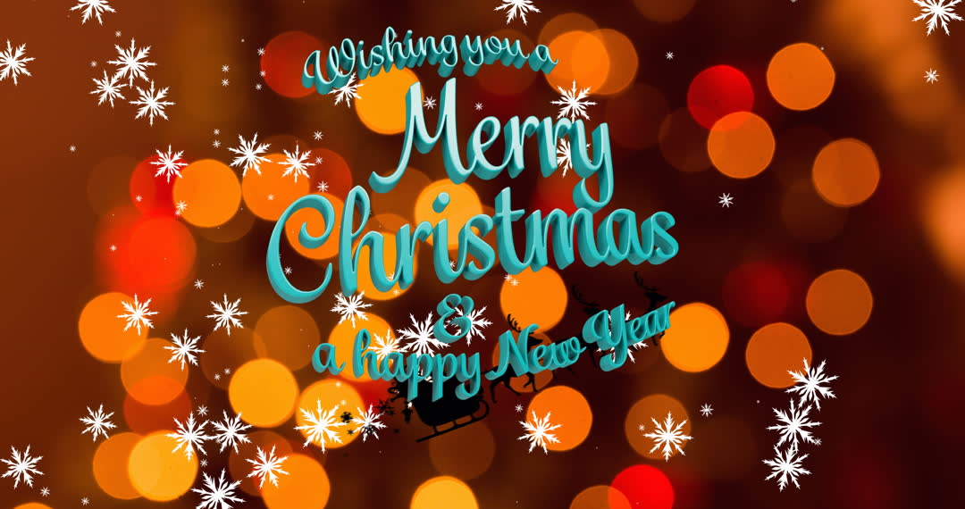 Greeting card design featuring vibrant text wishing Merry Christmas and Happy New Year overlaying a warm bokeh light background with snowflakes. Ideal for digital holiday cards, social media celebrations, and festive publicity materials.