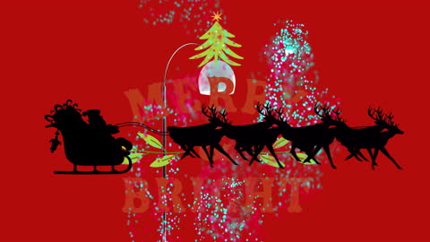Colorful Christmas illustration showing Santa Claus in silhouette riding a sleigh pulled by reindeer with a bold red backdrop. Glowing decorative elements and Christmas text are harmonized into the design, ideal for holiday greeting cards, festive digital creations, and cheerful winter themed decorations.
