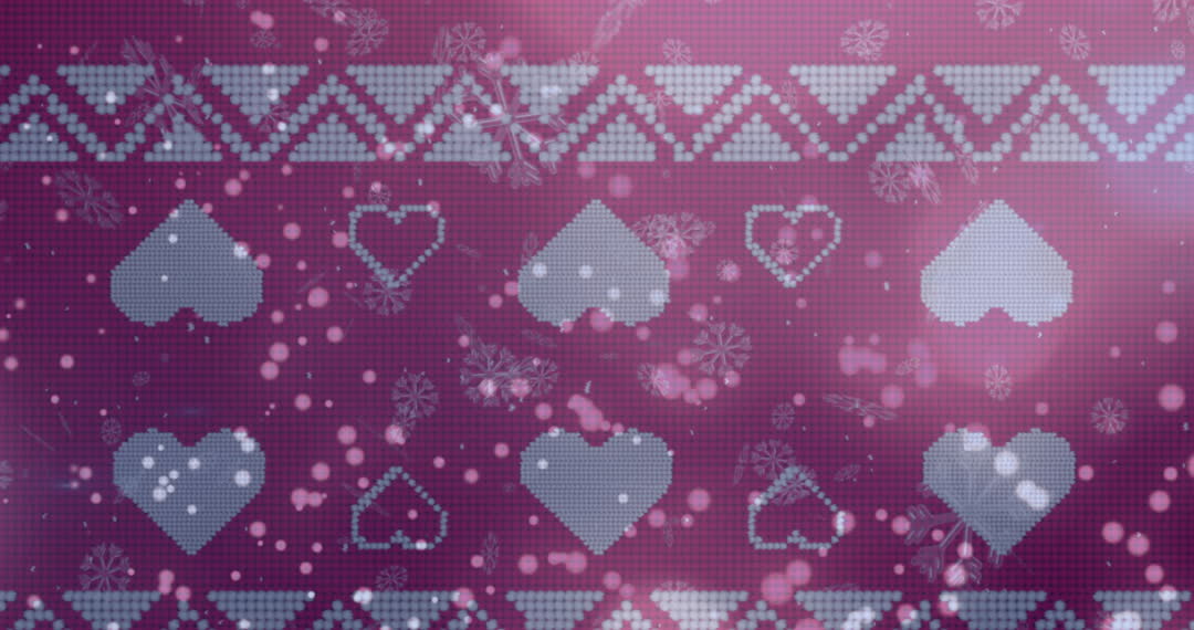 Image featuring digital animation of a festive Christmas knit pattern with hearts and falling snowflakes. Bright pink background enhances the traditional winter design. Useful for holiday greeting cards, festive backgrounds, or promotional materials for seasonal events.