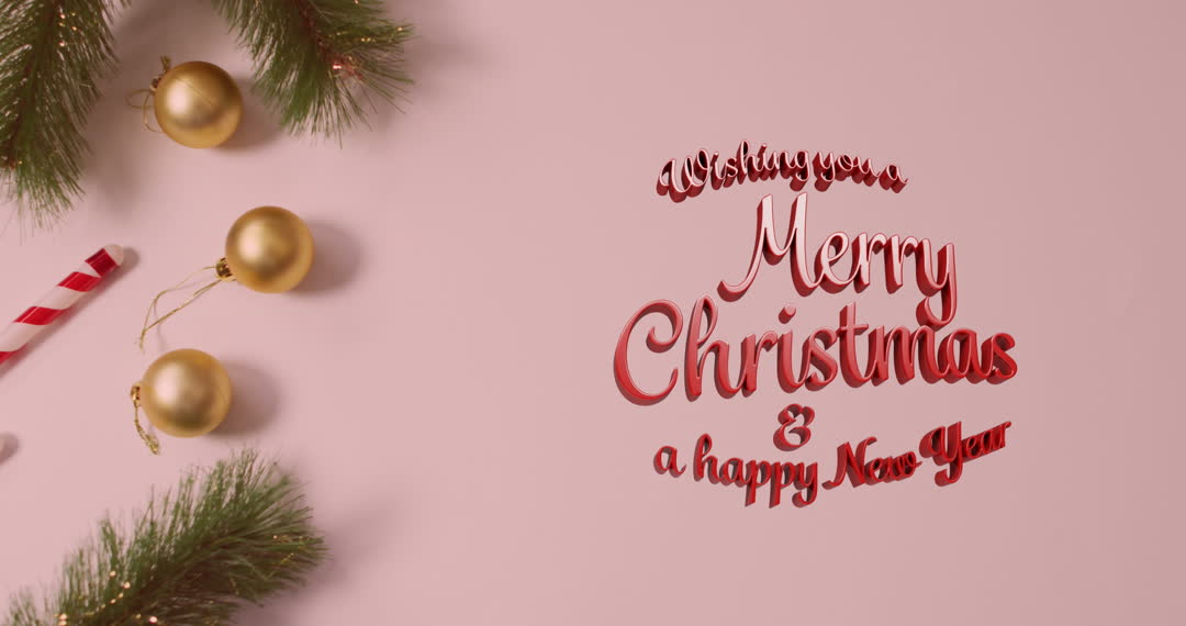 A charming scene features elegant holiday decorations with gold baubles and pine branches on a pink background. The festive script 'Merry Christmas & Happy New Year' adds warmth, making it ideal for holiday greetings, cards, or social media posts celebrating the season's joy and connections.