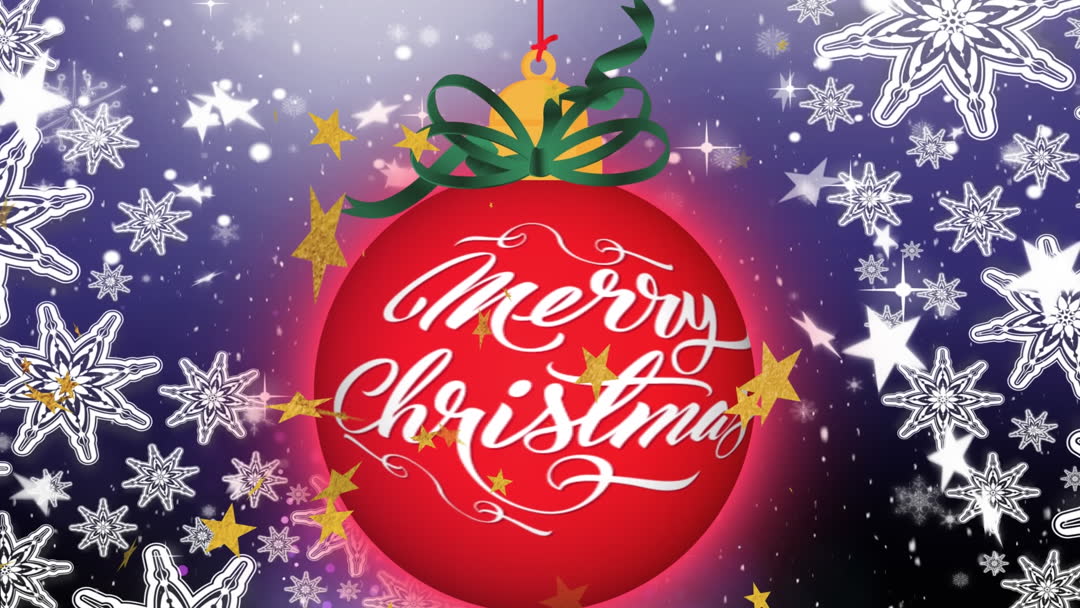 This vibrant and festive scene features a striking red Christmas ornament with elegant 'Merry Christmas' calligraphy surrounded by animated snowflakes and golden stars. The lively composition is perfect for holiday greeting cards, festive invitations, or any Christmas-themed promotional material, adding a touch of seasonal joy and celebration.