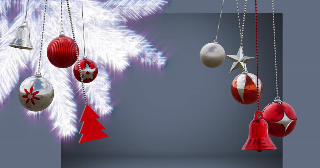 This is a festive scene featuring a selection of ornate Christmas ornaments hanging from a brilliantly illuminated digital pine branch against a smooth gray background. It portrays a holiday theme with classic red and silver decor for elegance. Ideal for use in Christmas cards, holiday ad campaigns, decorating designs, or festive event promotions, this scene adds elegance and seasonal spirit.