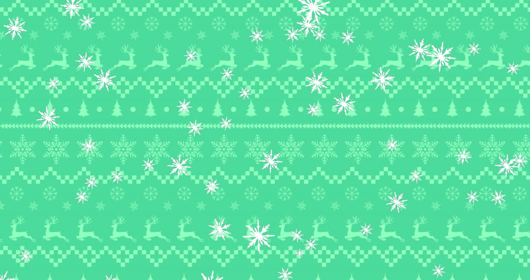 Seamless Christmas pattern featuring white snowflakes, reindeer, and trees on green background. Suitable for holiday greetings, wrapping paper designs, festive wallpapers, and seasonal crafts.