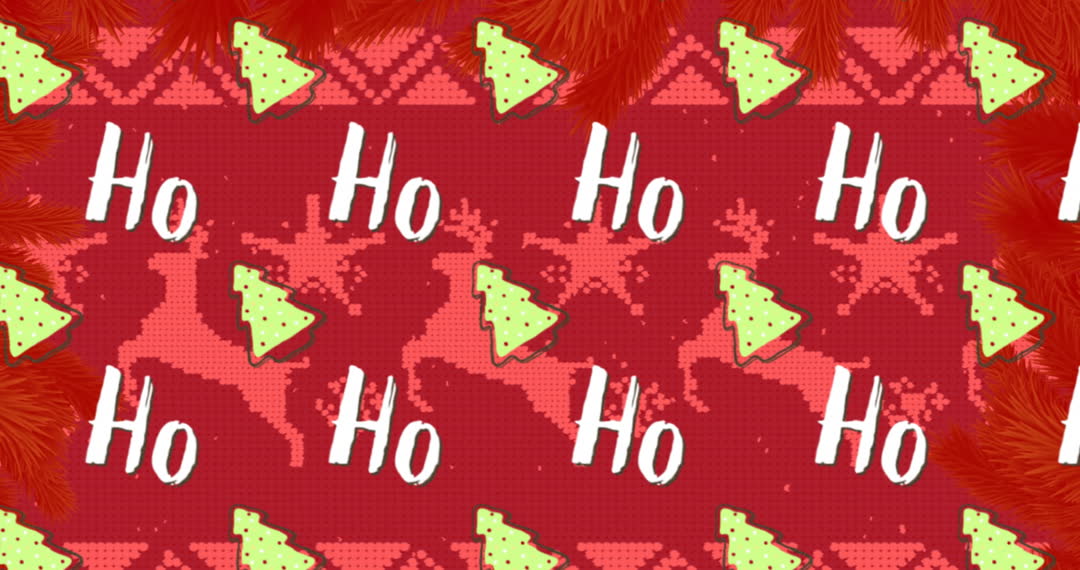 This digital festive pattern features animated snowfall over a vibrant design with Christmas trees, 'Ho Ho Ho' text, and reindeer silhouettes on a red background. Ideal for holiday-themed presentations, digital greeting cards, social media posts, festive websites, and event invitations to convey the joy and celebration of the Christmas season.