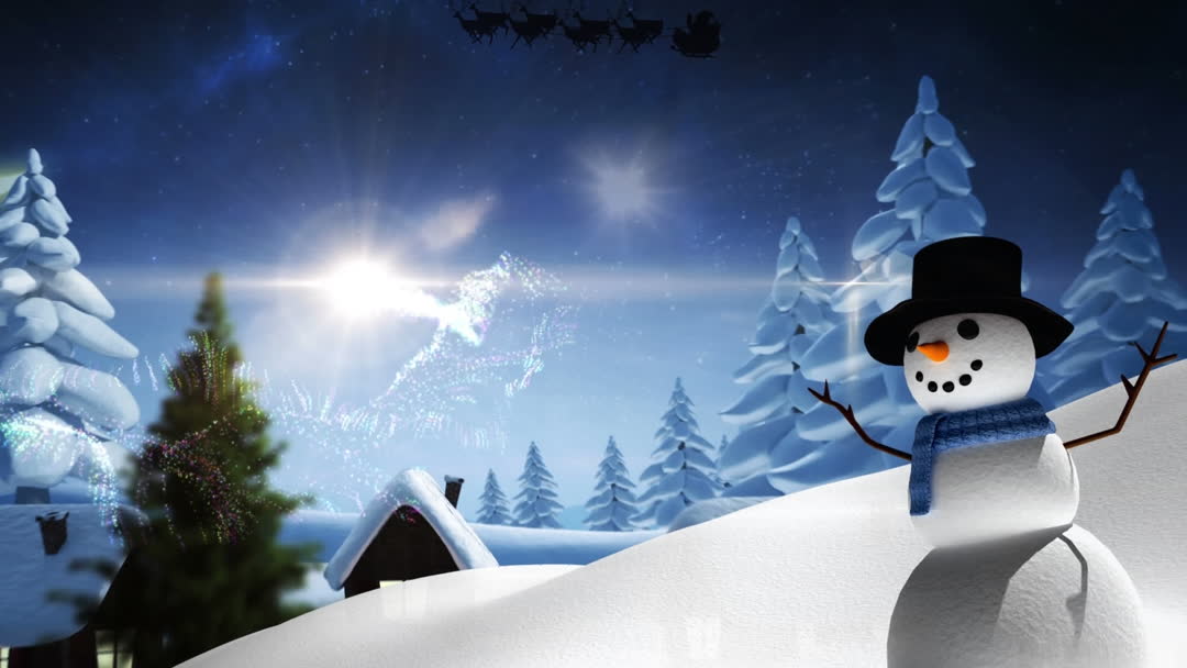 Charming winter holiday scene features a snowman, ornamented in top hat and scarf, while Santa's sleigh flies across a starry night sky. Gentle snowfall adds atmosphere for seasonal greeting cards, festive invitations, or digital backgrounds celebrating Christmas and winter traditions.