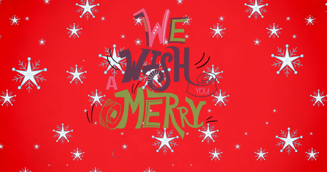 Digital animation featuring 'We Wish You a Merry Christmas' text with falling snowflakes on a vibrant red background. Perfect for use in festive greeting cards, holiday advertisements, invitations, or social media posts to enhance the Christmas atmosphere.