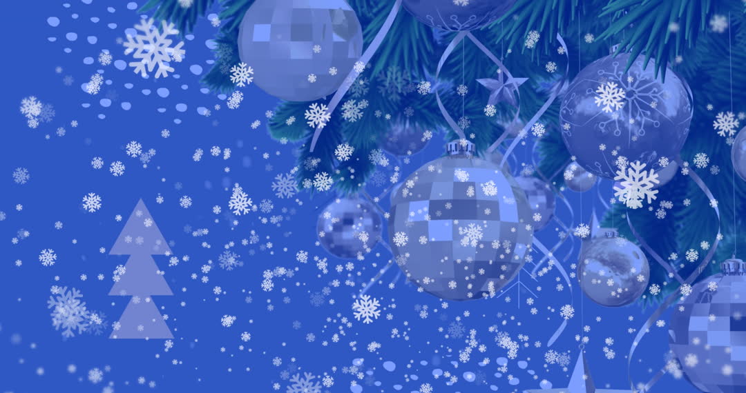 The video depicts a vibrant festive scene where a Christmas tree branch is adorned with decorations. Glittering ornaments hang elegantly as cartoon snowflakes gently fall over a deep blue background. This creative and warm portrayal can be a perfect fit for festive occasion advertisements, holiday season greeting cards, or festive event announcements.