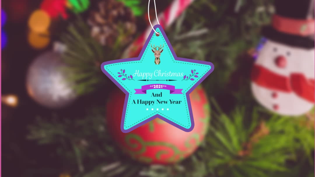 Beautiful gold and red Christmas label adds charm to festive decorations. Label displaying 'Happy Christmas 2021 and A Happy New Year' hangs delicately among evergreen needles, embellishing atmosphere of warmth and joy. Effective as part of holiday-themed designs for greeting cards, invitations, or festive crafts. Emphasizes nostalgic and retro themes in both amateur homes and professional services seeking inventive booth displays for holiday markets.