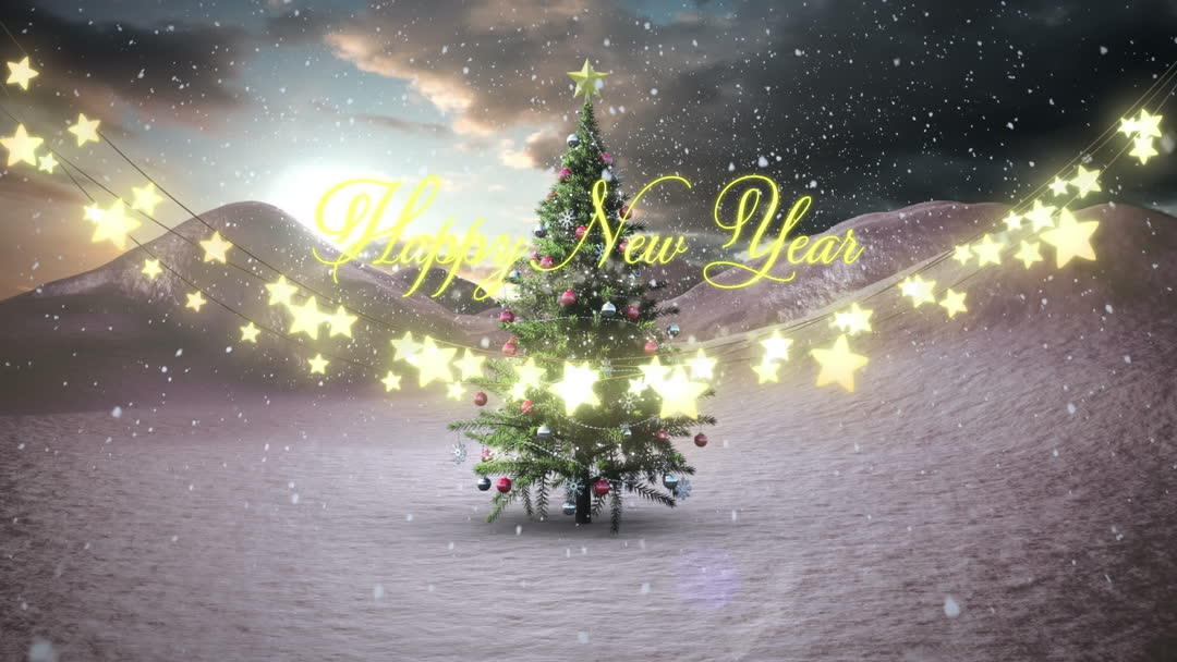 Features a beautifully decorated Christmas tree in a snowy landscape with animated falling snow. The scene is highlighted by a glowing 'Happy New Year' message, adding a festive and cheerful touch. Ideal for holiday greetings, winter celebrations, and promotional materials for Christmas and New Year's events.