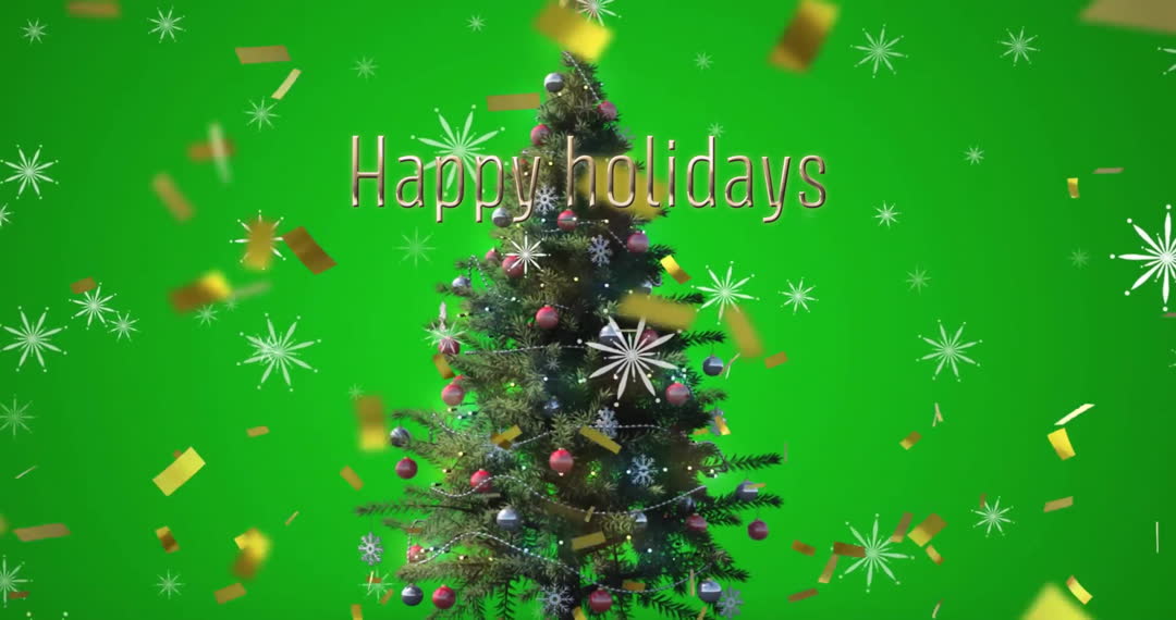This digital scene features a decorated Christmas tree with snowflakes and confetti on a green background, with 'Happy Holidays' written above. Perfect for holiday greeting cards, social media posts, and festive digital communications highlighting the spirit of Christmas and New Year celebrations.