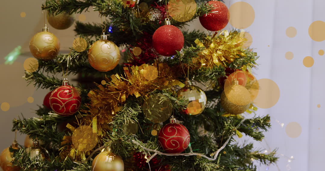 Christmas tree decorated with red and gold ornaments, sparkling lights, and tinsel creates a festive atmosphere. Perfect for holiday cards, seasonal marketing, or craft inspiration ideas.