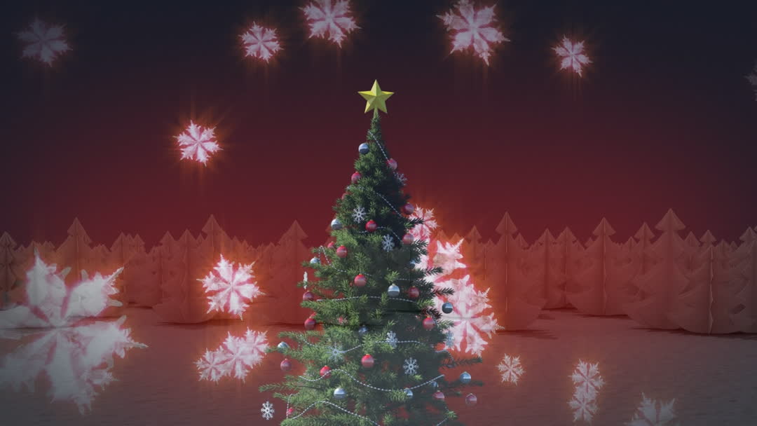 Stylized Christmas scene with a tree adorned with colorful ornaments and a shining star on top. Snowflakes gently fall around the tree. Perfect for holiday-themed videos, festive presentations, digital greeting cards, and seasonal marketing materials.