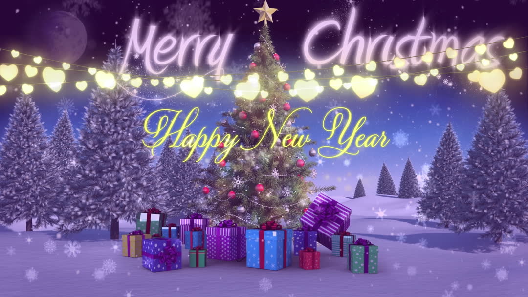 Celebrating Christmas and New Year's Eve with a decorated Christmas tree and gifts surrounded by a snowy landscape. Bright text reading 'Merry Christmas' and 'Happy New Year' enhances a joyful and festive atmosphere. Perfect for holiday greeting cards, social media posts, digital videos, or festive slideshow presentations.