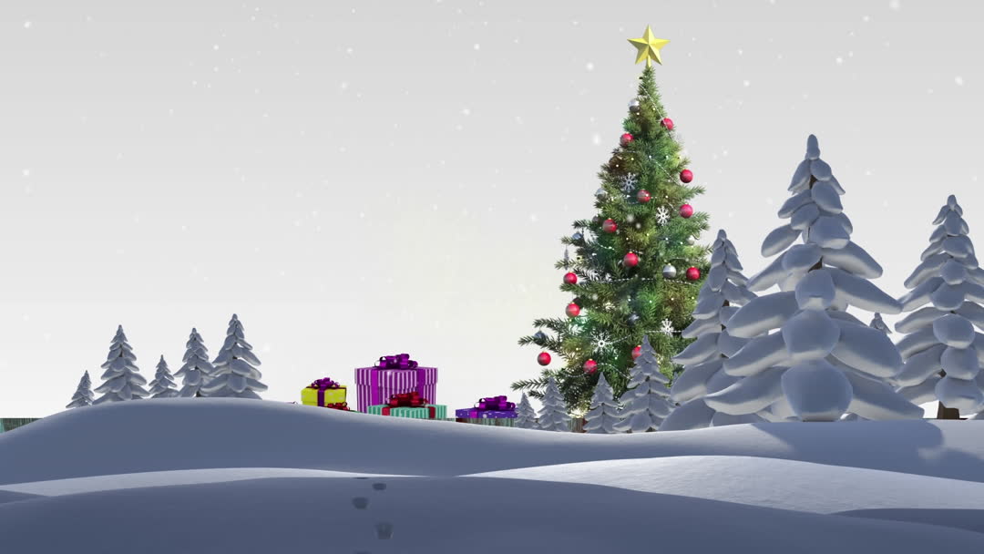 - Festive Christmas Tree with Snowfall and Presents in Winter Wonderland