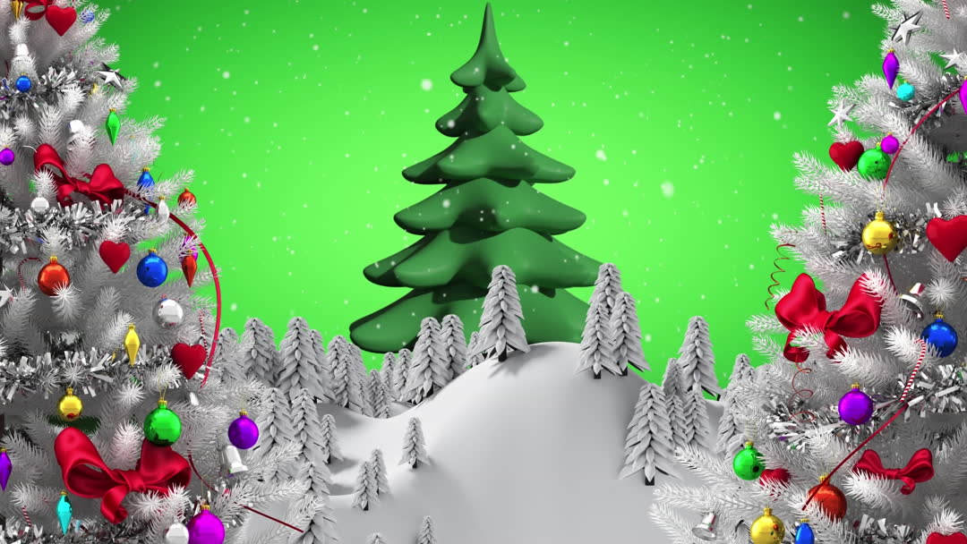 This vibrant scene showcases snowy white Christmas trees adorned with ornaments against a bright green animated background, creating a festive and joyful atmosphere. Great for digital Christmas cards, holiday-themed presentations, or festive wallpapers. Captures the enchantment and warmth of the holiday season.