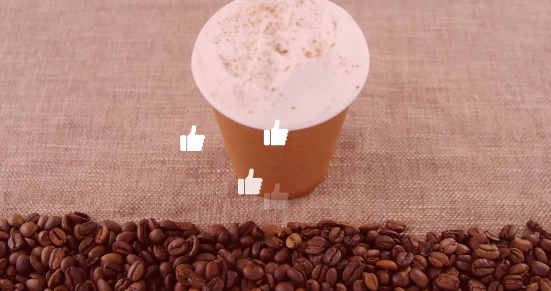 Brown takeaway cup filled with frothy cappuccino, dusted with chocolate. Visible coffee beans at bottom, alongside animation of digital likes. Ideal for digital media, social media promotions, or holiday coffee shop campaigns.