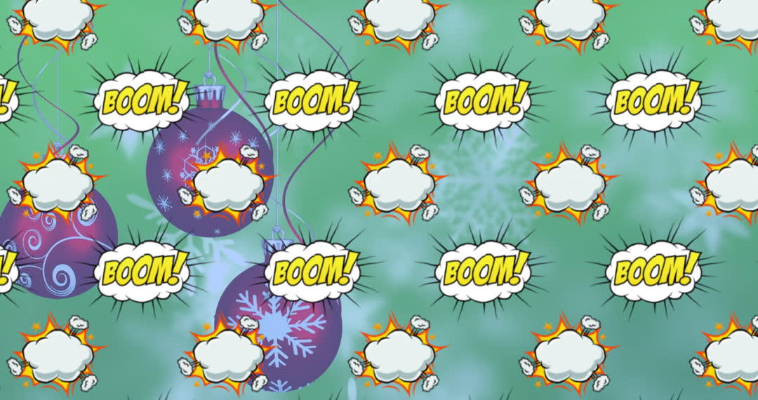 Animated comic style pattern with vibrant 'Boom' text over bauble decorations and snowflakes on a green background. Ideal for fun Christmas greeting cards, party invitations, holiday digital wrapping paper, or festive design elements conveying a joyful and energetic atmosphere.