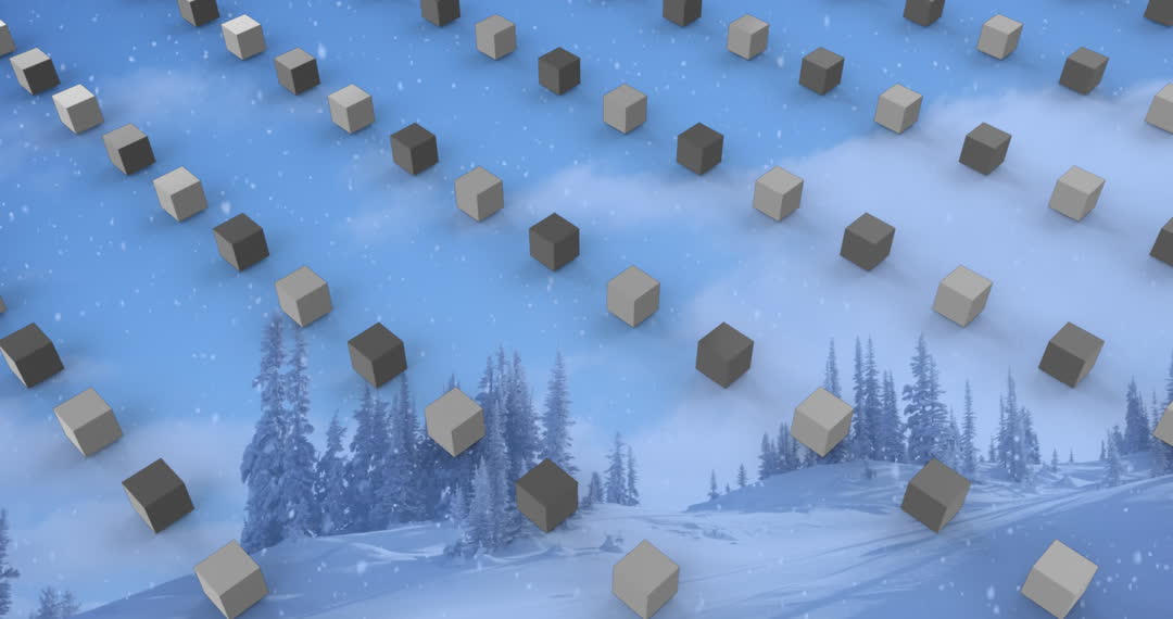 Cubes arranged in geometric pattern over a snowy winter landscape suggest a festive, modern twist to holiday visuals. Best for seasonal digital campaigns, artistic animations or adding a touch of whimsy to winter-themed designs.