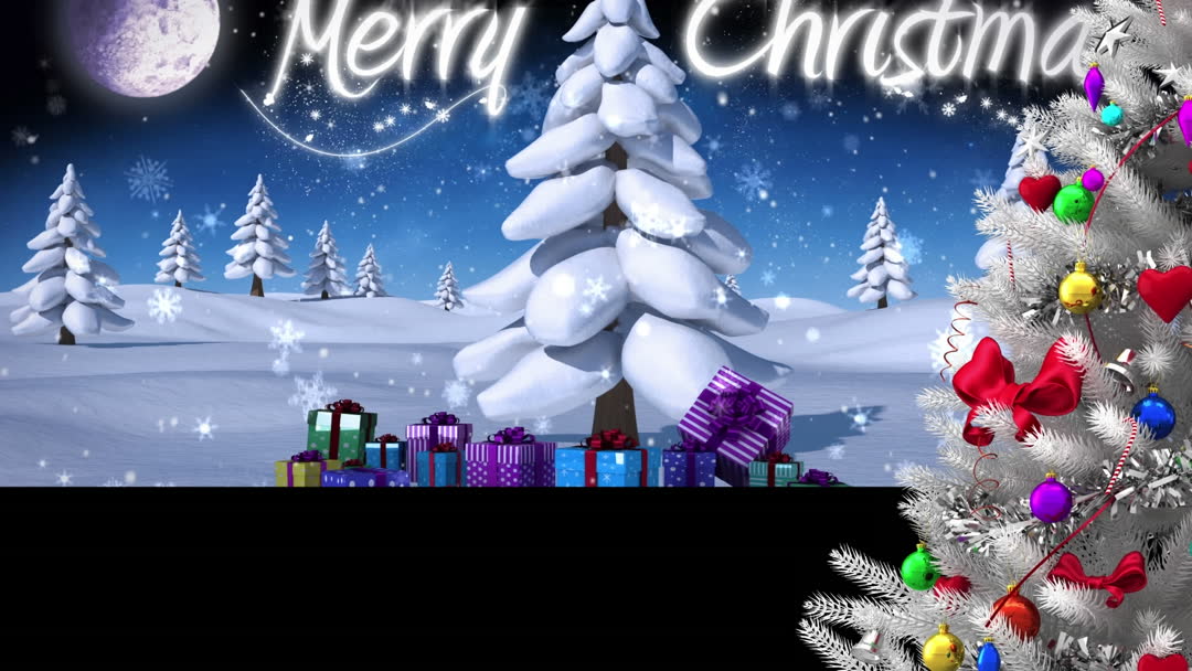 This vibrant digital animation features a merry Christmas message within a snowy landscape, accompanied by a well-decorated Christmas tree with colorful ornaments. The design captures the festive spirit, highlighting tradition and celebration. Ideal for use in holiday greeting cards, social media posts, or as a decorative background for festive occasions.