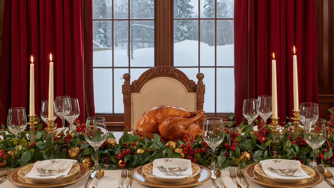 AI Generated Image. Video showcasing a beautifully set holiday dining table adorned with a roasted turkey centerpiece, surrounded by polished tableware and evergreen garlands with berries. Nearby flickering candlelight enhances the elegant and warm atmosphere, while the snowy landscape visible through the windows adds to the festive mood. Ideal for promoting holiday feasts, dinner gatherings, Christmas décor inspiration, and seasonal advertising.