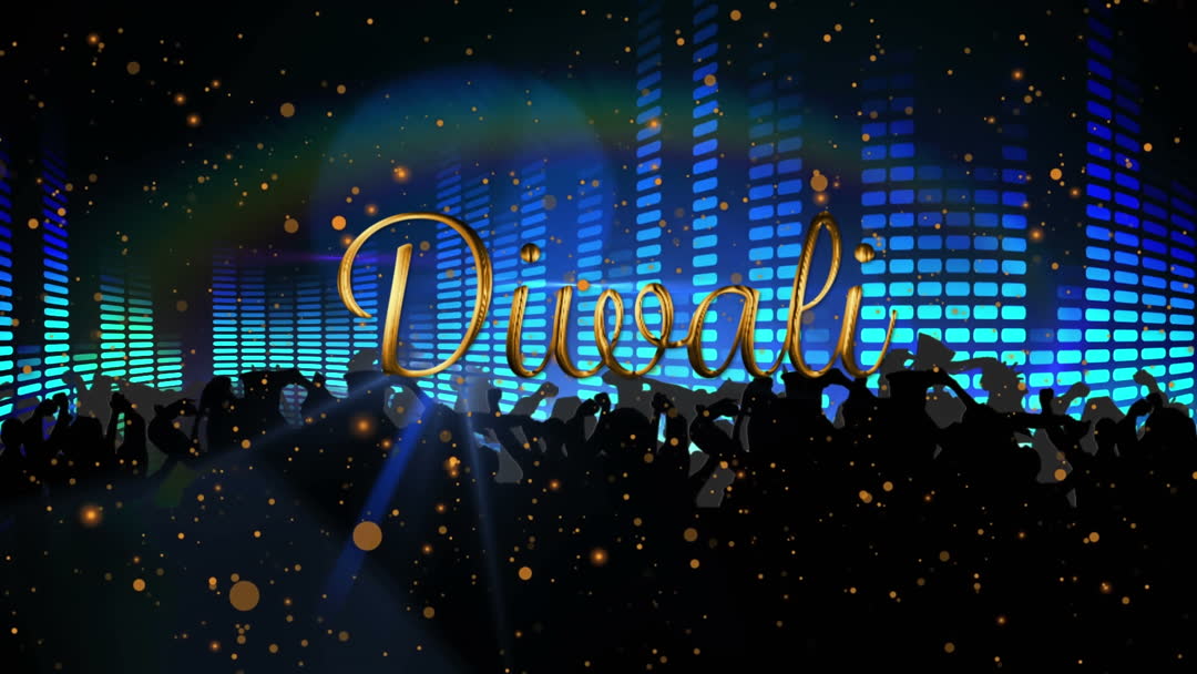 Digital animation depicting Diwali with lively crowd silhouettes against vibrant moving light columns evokes festivities, energy, and celebration. Suitable for themed event promotions, festive banners, or social media posts illustrating joyful community events.