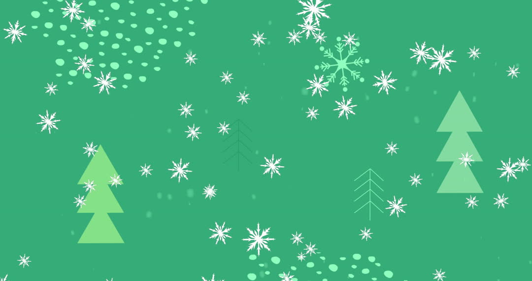 Captures the essence of winter with snowflakes gently falling against a simple green backdrop adorned with minimalist pine trees. Perfect for holiday marketing materials, festive greeting cards, digital backgrounds, and seasonal advertisement designs in need of a cheerful and wintery atmosphere.