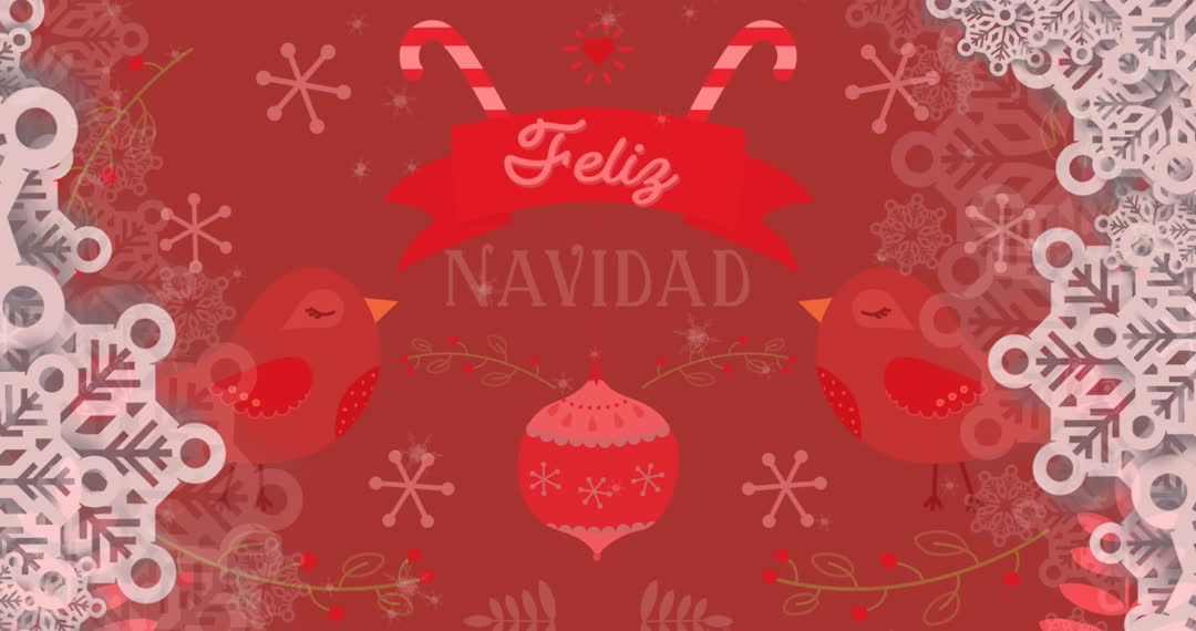 Digital Christmas greeting features festive birds and snowflakes with a 'Feliz Navidad' message, ideal for holiday e-cards, digital invitations, or social media posts conveying warm holiday wishes.