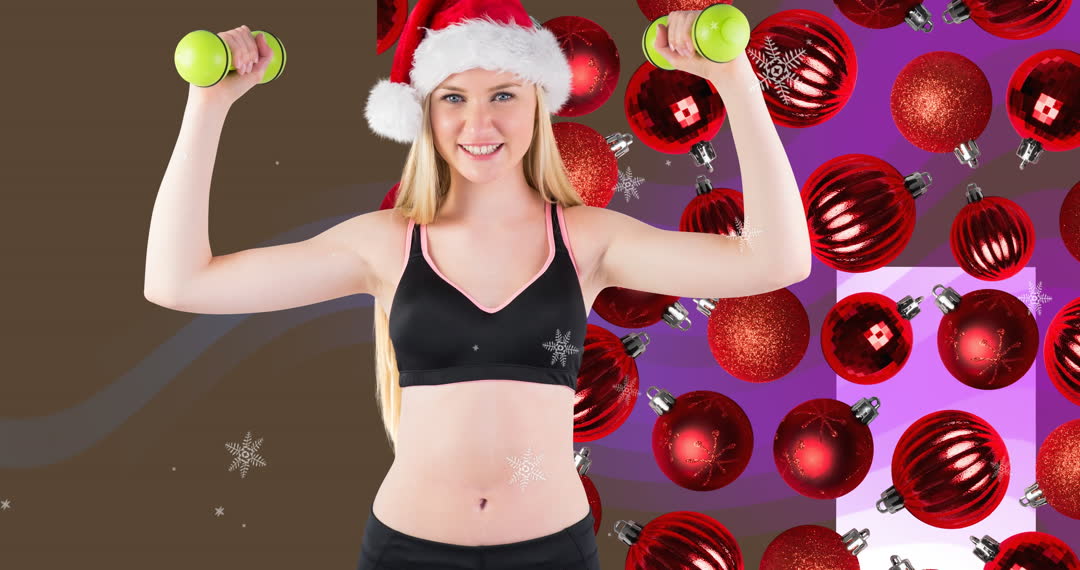 This colorful visual captures a young woman embracing a lively holiday spirit while exercising with dumbbells. The Santa hat and festive Christmas baubles in the background blend holiday cheer with a fitness theme. Ideal for fitness blogs, holiday workout promotions, or social media posts showcasing healthy living during the festive season.