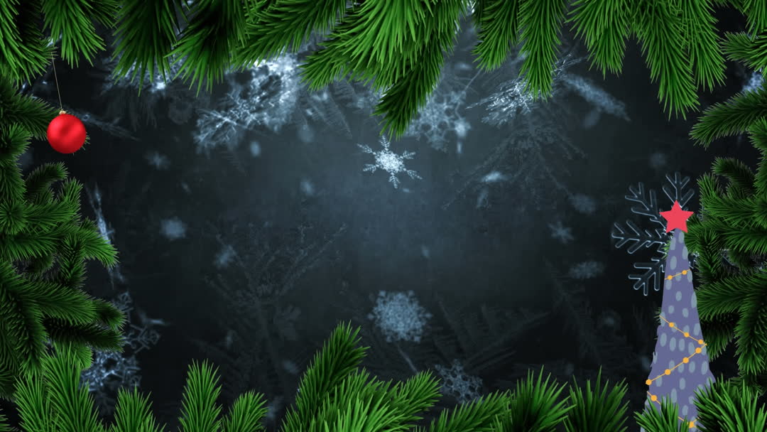 This festive design features a frame of animated fir tree branches around a dark background adorned with delicate snowflakes. Accents of holiday cheer are added with the appearance of a single red ornament and a whimsically illustrated Christmas tree. Ideal for use in holiday-themed greeting cards, digital backdrops for celebratory posts, or video applications looking to capture the essence of Christmas with warm, cozy vibes.